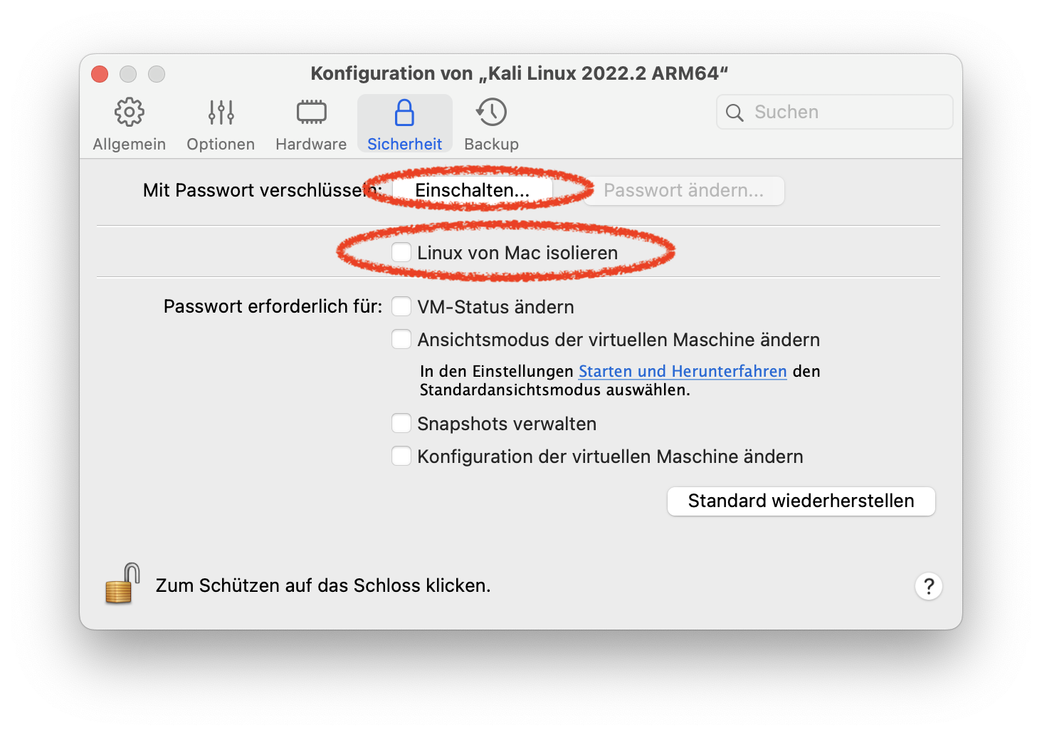 - Klicke auf „Linux von Mac isolieren“, um eine sichere Umgebung für Kali Linux zu gewährleisten.